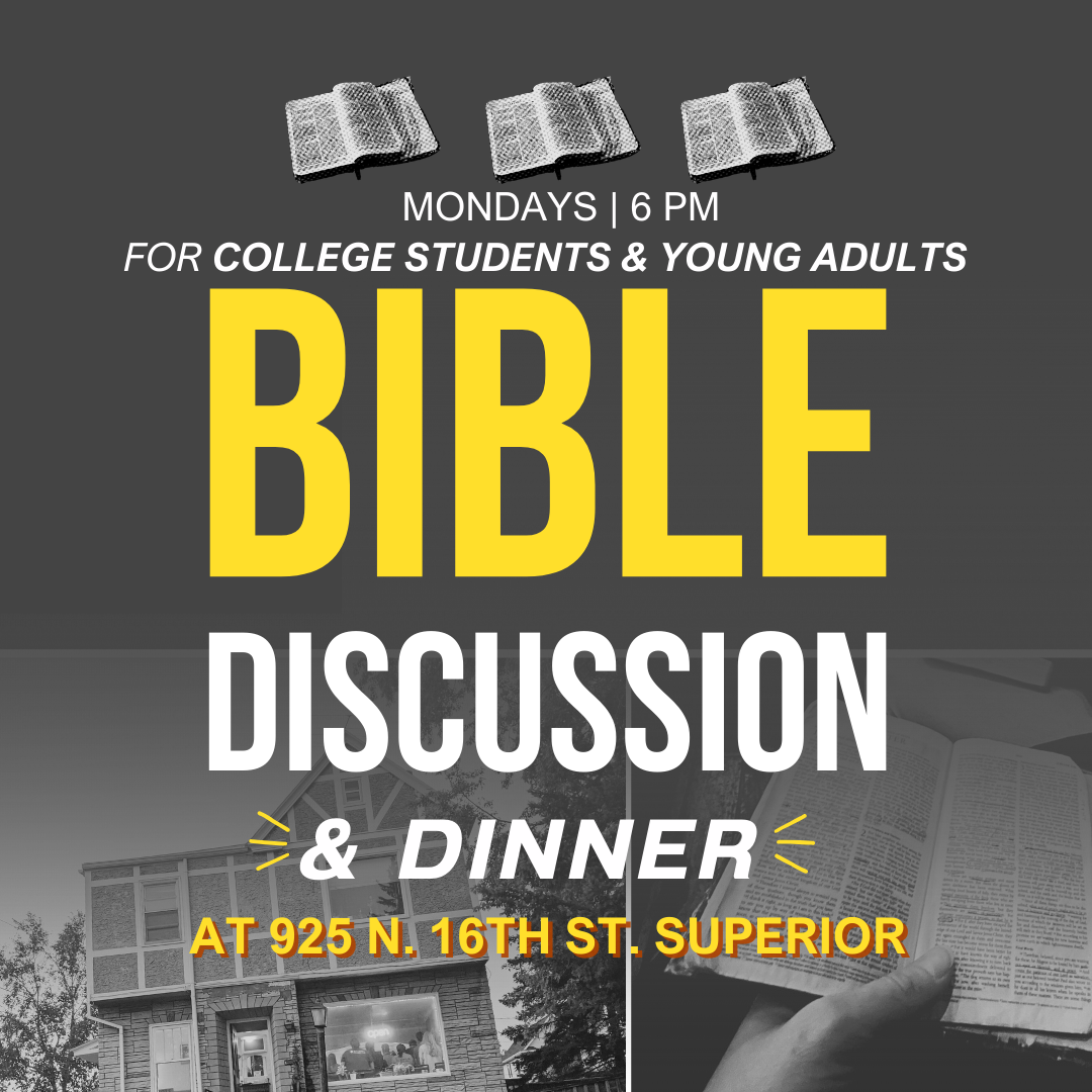 Join us every Monday night during the school year at 925 N. 16th St. in Superior for a living room Bible Study. Our first meeting for the 2nd semester will begin on January 26, 2026. We meet on the first floor of our campus ministry house for dinner at 6:00 pm followed by a Bible study at 7:00 p.m.